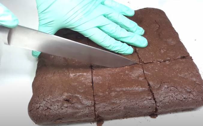 3. Я выпекаю на среднем уровне. При всей своей простоте и элементарности у брауни есть одна отличительная особенность — их никогда не пропекают до конца! У правильно приготовленного Брауни зубочистка не должна выходить полностью сухой и чистой. У меня он выпекался 20 минут, но время выпечки зависит от толщины теста в форме. Сразу же прямо в бумаге вынимаем из формы и даём полностью остыть на решётке или на деревянной поверхности. Этот десерт лучше недопечь, чем перепечь. Сверху должна образоваться тонкая хрустящая корочка, а внутри Брауни должен остаться слегка влажным, кремовым (но не жидким). Нарезать на кусочки нужно полностью остывший Брауни или, немного охлаждённый в холодильнике.
