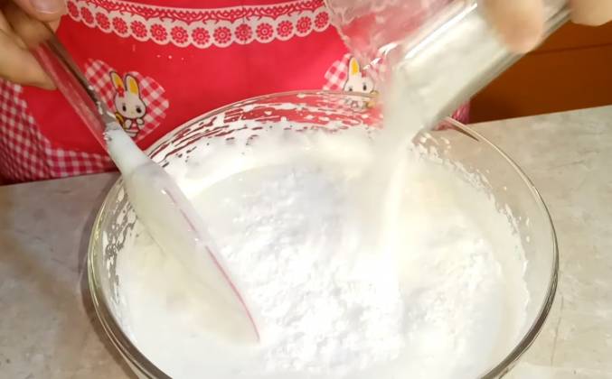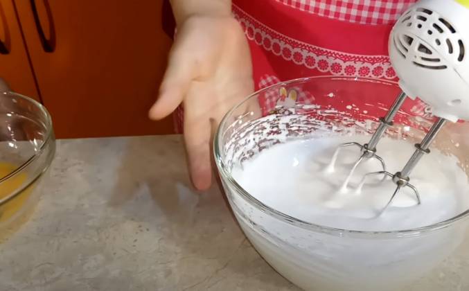 2. Белковая масса у меня получилась белой и давольно таки плотной как вы видите, да? и теперь нам осталось добавлять желтки, желтки я буду так же добавлять по 1 ложечке и взбивать миксером. Миксер я уже убрала, он мне уже не понадобится и теперь нам осталось всыпать муку. Всыпаем муку, так же по немножечку и буду я перемешивать с низу в вверх. Тесто уже готово, мы его убираем в сторонку.