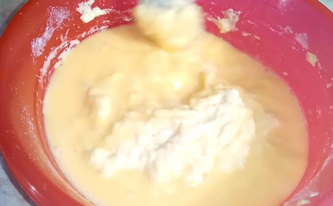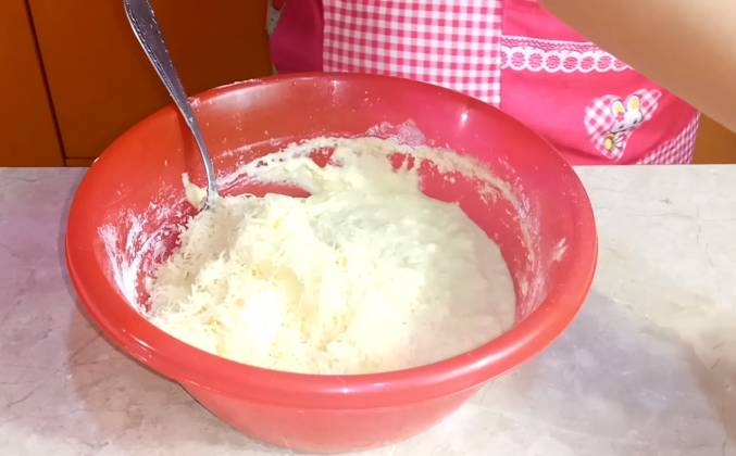 2. Пшеничную муку пересыпаем в миску где будем замешивать тесто и сюда же добавляем кукурузную муку и хорошо перемешиваем. Добавляем сыр натертый и растопленное сливочное масло охлаждённое и хорошо перемешивать. А отдельной миске взбиваем яйца и после чего будем вводить их в тесто. Тесто уже готово, теперь мы будем подготавливать формочку в которой будем выпекать хлеб.