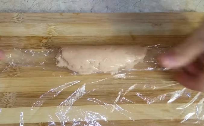 2. Полученную массу мы перекладываем в миску и хорошо так же все перемешиваем, если что можно все вместе обратно переложить в блендер и еще раз хорошо перемешать. Подготавливаем пищевую пленку в которую мы будем заворачивать сосиски, выкладываем 1 столовую ложку и аккуратненько заворачиваем, по возможности убираем весь воздух. По краям заворачиваем хорошо, чтобы вышел весь воздух и на концах завязываем ниточкой. и так мы проделываем со всеми сосисками. После чего мы опускаем наши готовые сосиски в холодную воду, доводим до кипения, после того как они закипят, мы делаем не большой огонь и варим еще 20 минут.