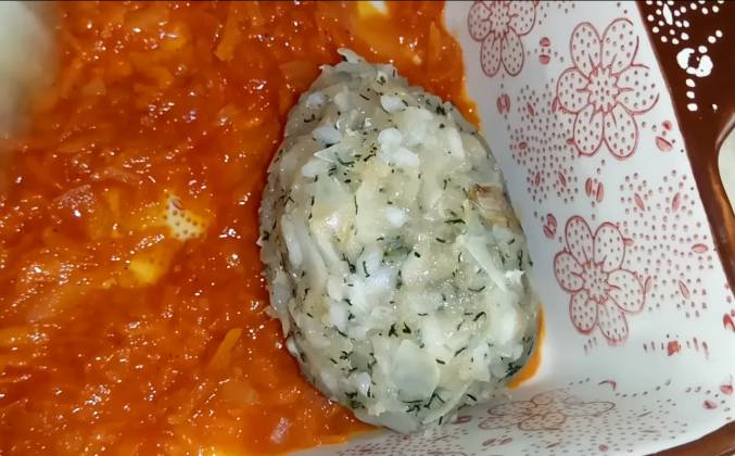 2. Займёмся зажаркой! Измельчаем 1 луковицу, натираем на крупной тёрке 200 граммовую морковку и я буду использовать свежие помидоры. Помидоры мы разрезаем пополам, убираем сердцевинку и натираем на крупной тёрке. На сковородку наливаем немного масла, выкладываем лук и морковку и жарим до золотистого цвета. Добавляем свежие помидоры и я использую 68 грамм томатной пасты, хорошо мы перемешиваем и добавляем пол чайной ложки соли, пол чайной ложки сахара и пол чайной ложки чёрного перца, хорошо перемешиваем и оставляем потушиться примерно 2-3 минуты, после чего зажарка готова. Берём блюдо в котором будем делать голубцы, на дно выкладываем немного зажарки, так чтоб всё дно было покрыто зажаркой и формируем голубцы, нужного вам размера.