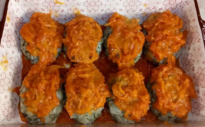 3. Сверху на голубцы выкладываем зажарку, так чтобы голубцы были покрыты зажаркой и отправляем в разогретую духовку до 200 градусов, выпекаем 30 минут. Готовые голубцы достаём и подаём на тарелочку, с верху поливаем сметанкой и посыпаем зеленью, по желанию. Голубцы получаются намного вкуснее чем обычные, я вам советую их приготовить. Так же подписывайтесь на мой канал и ставьте пальчик вверх, а вам я желаю приятного аппетита!Видео рецепт ютуб ниже 👇