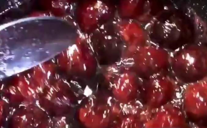 2. Как только поставили выпекаться бисквит, можно заняться начинкой. Вишню и сахар смешать и довести в сотейнике до кипения, крахмал развести в 1 ст.ложке воды и вылить в вишню. Прокипятить 1 минуту, помешивая, и снять с огня. Орехи немного поджарить на сковороде/в духовке и порубить не очень мелко ножом.
