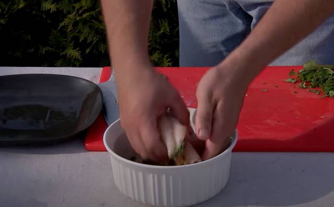 2. С кальмарами всё очень просто, мы почистили их от плёнки и сейчас я хочу сделать небольшие надрезы. Для того, чтобы маринад у нас лучше попал внутрь и, при готовке на гриле, кальмар станет у нас очень красивым, чуть позже вы поймёте, о чём я говорю. Кстати, кальмар у нас уже потрошён. Не прорезаем кальмар до конца, делаем надрезы верхней части. С одной стороны. Делаем ромбик. И с другой стороны. Добавляем наши кальмары в маринад. И хорошенько перемешиваем между собой. Если вы были в Азии, либо пробовали уже блюда в таком стиле, вы понимаете, о чём я говорю. Запах кинзы с рыбным соусом - волшебно. Я мариновал кальмары в течение 3 часов, для морепродуктов, для рыбы это более чем достаточно.