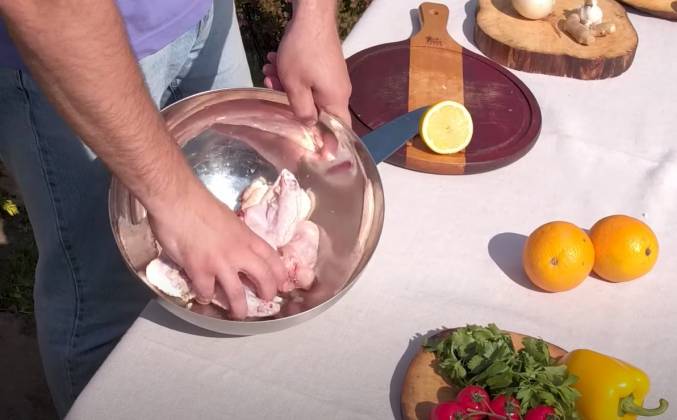 2. Добавляем с вами сок половины лимона, но, прежде чем разрезать его пополам, покатайте его слегка по столу, чтобы он выделил больше сока. И, конечно же, немного соли и перца. Соли я возьму одну чайную ложку. А перца будет достаточно половины чайной ложки. Теперь хорошенько это всё перемешиваем и оставляем мариноваться в холодильник на 2 часа. Итак, у нас прошло с вами два часа. Я уже подготовил гриль к готовке, сделал зону прямого и непрямого жара. Это очень важно, потому что мы с вами должны курицу запекать на непрямом огне. А это значит что корзинки с углём я расположил в этой и в этой части, а вся вот эта площадь у нас будет открыта для курицы. Перекладываем на решётку.