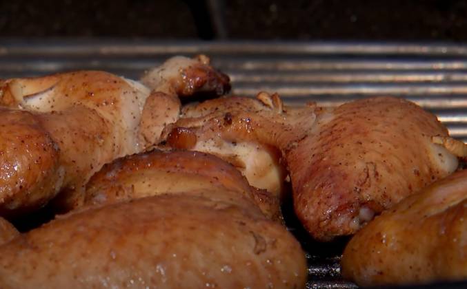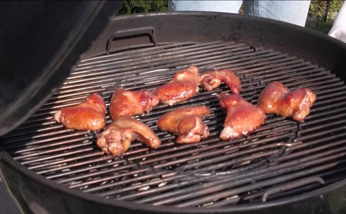 4. После этого мы с вами добавим глазурь и доведём их до готовности, корочка у них получится хрустящая и очень вкусная. Итак, прошло, примерно, 15 минут. Посмотрите, здесь, конечно, глазурь, как-будто, уже и не нужна, но добавим её. Берём кисточку и смазываем нашей глазурью курицу. Курица сразу становится у нас глянцевого цвета, посмотрите. И здорово, что мы с вами добавили сок лимона, потому что мёд у нас был густой, а сейчас он, как раз, в той консистенции, какой и должен быть. Этой глазури хватит нам, наверно, ещё на 4 порции таких крылышек. Отлично, закрываем крышку гриля и готовим ещё, примерно, 10 минут. Нет времени ждать, оно пахнет очень вкусно. Да и выглядит это замечательно, посмотрите как сок внутри у нас бурлит.