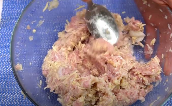 2. За это время приготовим начинку, в миску кладём 250 грамм фарша, 50 грамм сыра, натрём на крупной терке, если нет сыра, его можно не добавлять, луковицу измельчаем при помощи блендера и добавляем к фаршу, кладем 1-3 чайные ложки соли и чёрный перец по вкусу и перемешиваем. Начинка готова. Прошло 60 минут, тесто поднялось, кладём его на стол и обминаем, раскатываем тесто скалкой, толщиной примерно 5-7 миллиметров, стаканом вырезаем кружочки, обрезки собираем, раскатываем и опять вырезаем кружочки.
