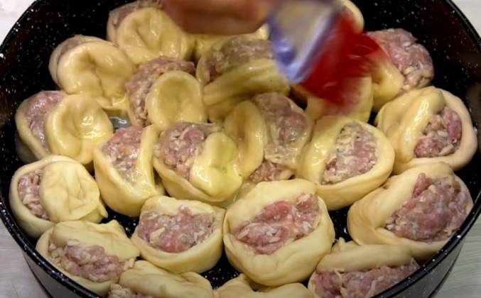 3. На кружочек кладём фарш, с двух сторон закрепляем и соединяем края, как показано в видео, берем форму, у меня диаметр форме 26 сантиметров, смазываем маслом, кладем заготовки в формы, желток смешаем с одной столовой ложкой молока и смазываем пирог. Дадим пирогу постоять минут 10, затем ставим в духовку, выпекаем при 180 градусах до готовности, у меня занимает примерно 35 минут, во время выпечки фарш выделит много сока, все так и должно быть, в процессе выпечки тесто в себя впитает этот сок, благодаря чему пирог станет еще вкуснее.Видео рецепт ютуб ниже 👇