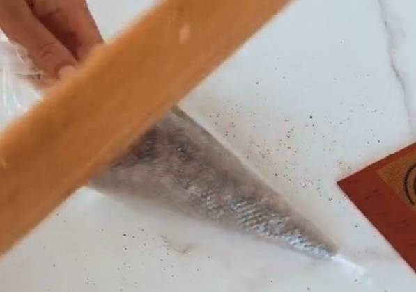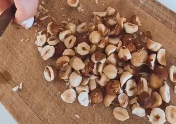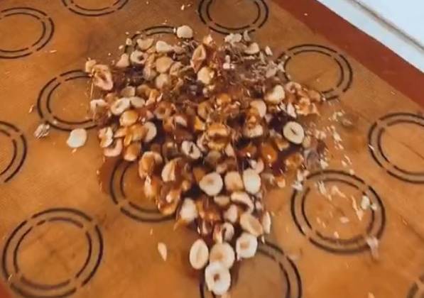 2. Когда полностью весь сахар растопился, снимаем кастрюлю с огня. Параллельно измельчаем орехи. Выкладываем на силиконовый или тефлоновым коврик. Пергамент и фольга НЕ подойдут. Выливаем карамель на орехи. Распределяем и оставляем остывать. Если у вас кондитерская вафля, то все просто. Если шарики или хлопья, то предварительно их измельчаем с помощью скалки и мешка. Остывшие орехи помещаем в блендер и измельчаем в крошку.