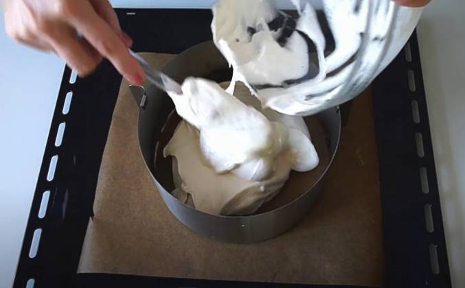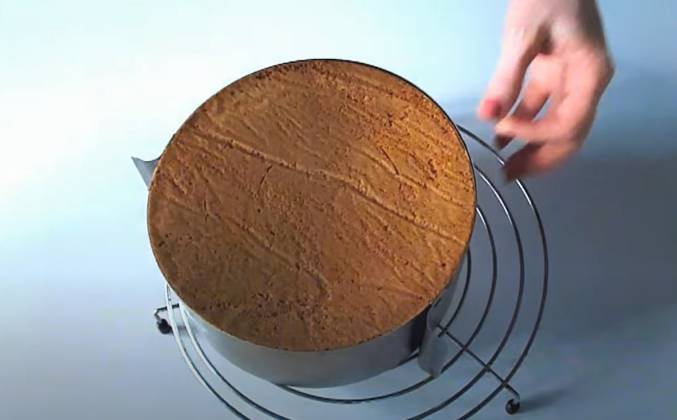 2. Теперь постепенно высыпаем мучную смесь, каждый раз промешивая лопаточкой движениями снизу-вверх. На выстеленный пекарской бумагой противень выкладываем разъемное кольцо диаметром 20-22 см. Выливаем тесто и избавляемся от больших пузырьков с помощью палочки. Выравниваем поверхность и выпекаем на среднем уровне духовки при температуре 180С 40 минут. Открывать дверцу духовки во время выпекания бисквита не следует, так как бисквит опадет и уже не будет пышным. Остужаем на решетке в перевернутом виде примерно 3 часа. Для отделения бисквита от формы воспользуемся ножом, аккуратно проводя и прижимая его к бортам формы, стараясь не повредить бисквит. Теперь нужно закрыть бисквит пленкой, убрать на 10 часов в холодильник.