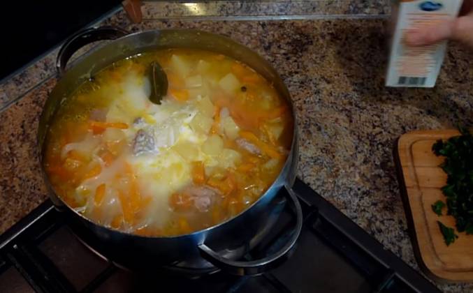 2. А картофель отправим к мясу. Нарежем сладкий перец на мелкие кусочки и слегка потушим с луком. Обжаренные овощи выложим поверх картофеля и зальем горячей водой так, чтобы содержимое кастрюли было полностью покрыто жидкостью. Накроем крышкой и тушим рагу на медленном огне после закипания 35 минут . Пока рагу тушится, подготовим остальные ингредиенты. Нарежем пучок петрушки. Также нам понадобится 1 лавровый листик, 6 горошин душистого перца, соль и сливки.