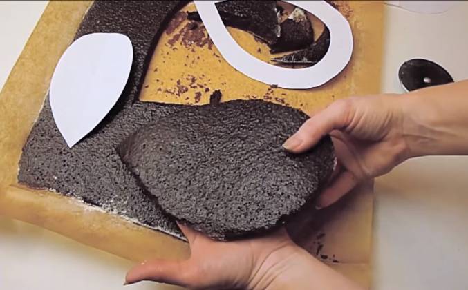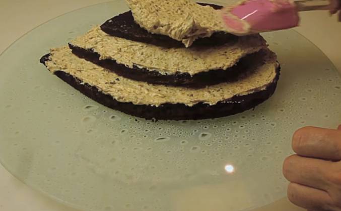 2. Готовый бисквит остужаем на решетке, не снимая с бумаги. Теперь подготовим шаблон из бумаги. Нарезаем остывший бисквит по шаблону. Приготовим ореховый крем. Для него можно взять смесь грецкого ореха и фундука в любых пропорциях. Ориентируйтесь на свой вкус. Орехи нужнослегка обжарить и по возможности очистить от шелухи. Нам нужно 120 граммов ореха. 100 граммов сахара, 120 граммов размягченного сливочного масла, 150г молока, Для ароматизации можно использовать 1 столовую ложку рома, коньяка или орехового ликера, а также 1 чайную ложку ванильного сахара. Если Вы готовите торт для детей, то исключите алкоголь. Вам ведь не нужны пьяные дети. Орехи измельчим в крошку, Соединим орехи, сахар, ваниль и молоко и поставим на небольшой огонь. Доводим до кипения , убавляем огонь и варим до загустения. У меня ушло примерно 10 минут. Снимем с огня и полностью остужаем. Сливочное масло взбиваем до пышности и посветления и в несколько приемов добавляем в него ореховую массу. Не забываем в конце добавить коньяк или ром. Крем готов и можно сразу же обмазать им коржи.