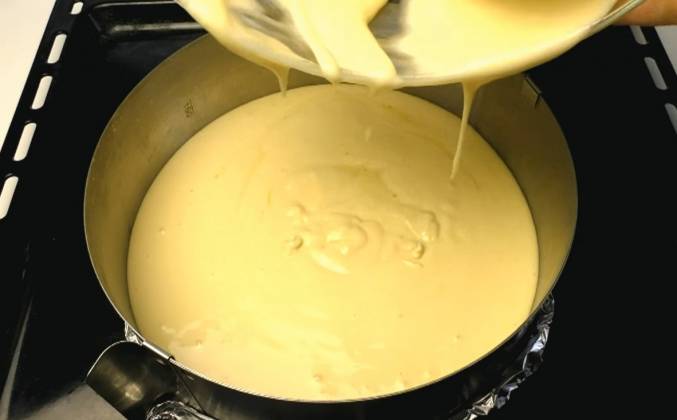 2. Убираем миксер. Он больше не понадобится. Остальное смешиваем лопаткой или ложкой. Подогретое до 80 С молоко небольшими порциями вливаем в тесто, каждый раз промешивая до однородности. Тесто готово. Выливаем его в форму диаметром 22-24 см. Форму я не смазывала, так как моя форма не имеет дна. Любую другую форму лучше выстелить пекарской бумагой или смазать маслом и присыпать мукой или сухарями. Отправляем в заранее разогретую до 175С духовку и выпекаем на среднем уровне 30-35 минут.