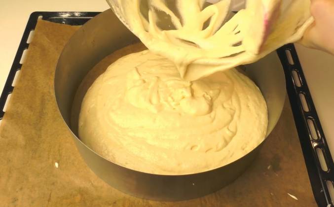 3. Выкладываем его на поверхность теста и очень быстро и недолго перемешиваем. Долго мешать нельзя, так как тесто может от этого опасть. Выливаем в заранее подготовленную форму, выстеленную пекарской бумагой. Смазывать форму по бокам не нужно, так как остужать бисквит будем в перевернутом виде. Выпекаем в хорошо разогретой духовке при температуре 200С в течение 30минут. Остужаем на решетке. Остужая, таким образом, бисквит не теряет своей формы. Диаметр моего бисквита 28 см, а высота 4 см. Если диаметр вашего бисквита будет меньше, то высота его соответственно увеличится.
