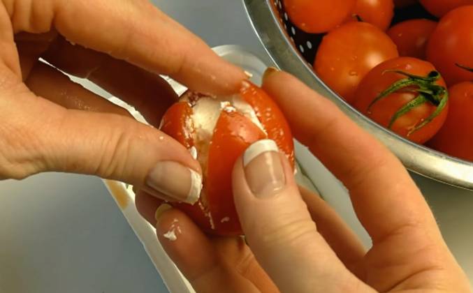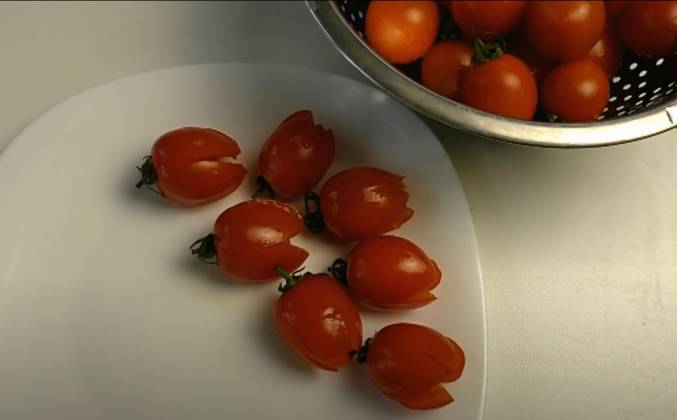 2. Сыр Фета для этой закуски подойдет как нельзя лучше. Слегка прижимаю лепестки. Вытираю все салфеткой, чтобы помидорки были совсем как тюльпаны, и осталось только уложить красиво на тарелку.