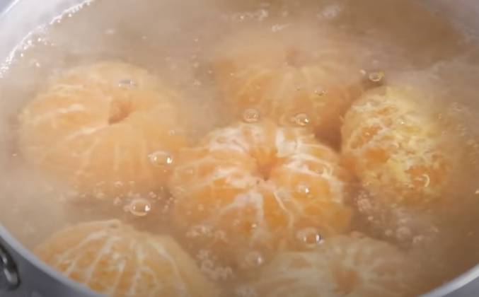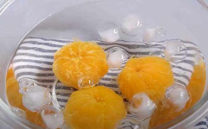 2. Положите их в холодную воду со льдом. Тщательно очистите мандарины. Наливаем в емкость воду 200 мл, 50 мл лимонного сока, 50г сахара. Перемешайте, пока весь сахар не растворится. Залить этим мандарины, оставить на 3 часа с каждой стороны, в общей сложности 6 часов.
