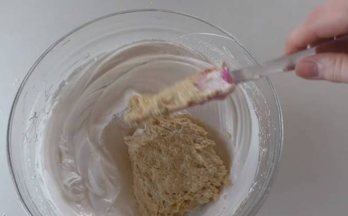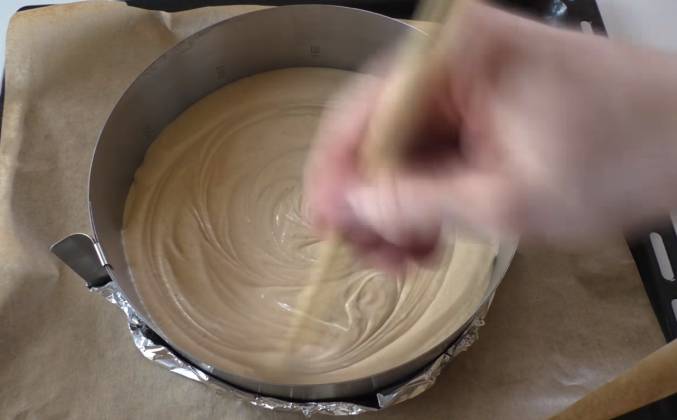 2. Отдельно смешаем муку с разрыхлителем и высыплем в карамельную смесь. Масса получится немного густой. Для соединения обеих масс сначала добавим в карамельную немного взбитого белка, смешаем до получения однородности, а затем также , порциями отправим ее в белковую, каждый раз промешивая до полного соединения. В результате должно получиться вот такое тесто абсолютно без комочков. Для этого количества теста используем форму диаметром от 22 до 24 см. Я выстелила фольгу, так как у меня не обычная форма для выпечки, а кондитерское кольцо и я легко извлеку из нее бисквит. Тем же, у кого разъемная форма с дном, на дно формы лучше выстелить бумагу для выпечки.