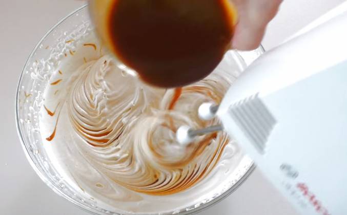 2. Взбиваем сливки сначала медленно в течение полминуты, постепенно ускоряя миксер до максимума. Взбиваем примерно 5 минут до плотного состояния. Постарайтесь не перебить сливки в масло. Теперь вводим карамель. Миксер устанавливаем на минимальные обороты и струйкой вливаем карамель.