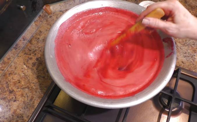 2. Огонь у меня достаточно большой. Это для того, чтобы варенье быстро достигло нужной температуры. Следим, чтобы варенье не убежало, постоянно помешивая. Прошло 2 минуты, выключаем огонь и добавляем коньяк. Будьте осторожны, варенье с коньяком создает маленький вулкан. Поэтому добавляйте коньяк в 2 приема. Все, варенье готово. Теперь его нужно разлить в горячие простерилизованные баночки с крышками, крепко закрыть, перевернуть и полностью остудить. И хранить такое варенье при комнатной температуре.