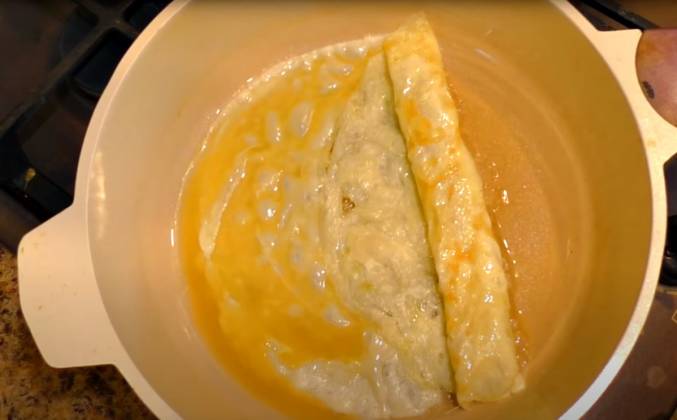 2. Смешаем все ингредиенты и процедим через сито. Эта процедура чудесным образом превращает смесь в однородную массу. Вилочкой так не собьешь, а от миксера появится ненужная пенка. Из мерного стаканчика будет легче наливать смесь на сковородку. Хорошо прогреваем сковородку на небольшом огне. Масло для жарки омлета я использую топленое сливочное. В Японии жарят на соевом масле. На вкус это конечно же влияет, омлет получается вкуснее на сливочном масле. Наливаем небольшое количество смеси и равномерно распределяем. Когда немного схватится, завернем в рулетик и отодвинув в сторонку, нальем новую порцию рядом. Опять свернем и повторим таким образом заливку, пока смесь не закончится.