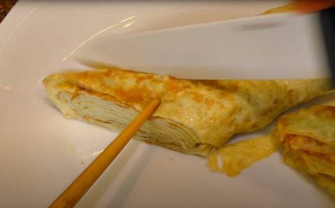3. Рулет сворачиваем плотно, формируя аккуратный рулон, прижимая его лопаточкой. Получился вот такой слоеный омлет. В Японии его подают с морской капустой на завтрак. А еще подобный омлет можно приготовить с добавлением мелко нарезанных овощей: сладкого перца, зеленого лука, кабачков и даже свежих огурцов и отварного риса. Только смешивать с яйцом их не нужно, а просто добавить посыпая каждый яичный слой прямо на сковороде.Видео рецепт ютуб ниже 👇
