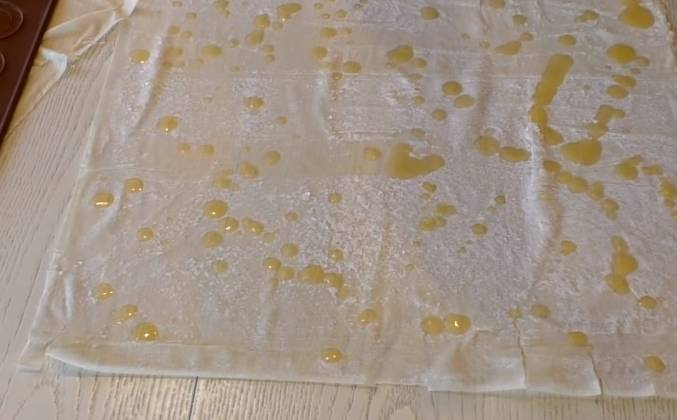 3. Теперь укладываем 2 слоя теста, слегка сбрызгивая растопленным сливочным маслом, у меня топленое, но использовать можно любое масло. В Греции как правило используют оливковое. В данном случае это не важно, можно использовать даже кокосовое. Смазывать слои не нужно, так как получится очень жирно. Тесто настолько тонкое, что может разорваться. Поэтому наносим масло точечно. Оно потом само растечется. Выкладываю половину начинки слоем 1. 5 см.