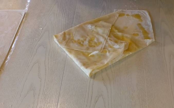 4. Заворачиваю конвертом, переворачиваю и укладываю на следующие 2 листа теста, также сбрызнув их маслом. Количество масло берем на глаз. Всего нам потребуется для двух бугац примерно 100 мл масла. Завернем конвертом и отправим выпекать в духовку. Температура 190 С. Достаточно 10-15 минут. Печь до румяной хрустящей корочки. Очень аппетитная корочка. Такая получается только из теста фило. А начинка, хоть и отдаленно напоминает манную кашку, но похожа на королевскую. Она же с лимонной цедрой.Видео рецепт ютуб ниже 👇