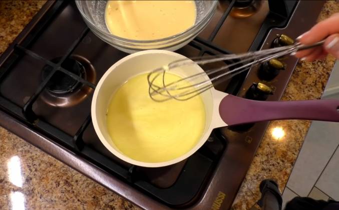 2. Добавляем яйца, ваниль и манку, и хорошо размешиваем. В кастрюлю наливаем оставшееся молоко, добавляем сахар 100 г, цедру и масло 50 г, ставим на огонь, постоянно помешивая, чтобы растворился сахар. Когда молоко закипит, очень тоненькой струйкой не прекращая помешивать вливаем яично-мучную смесь и завариваем крем. Готовый крем густеет и начинает булькать. Теперь снимаем с плиты и для ускорения остывания можно опустить его в миску с холодной водой, прикрыв крышкой, чтобы не образовалась корочка. Далее все очень просто. Достаем из упаковки тесто. Я хочу поздравить жителей России. Теперь тесто фило производят у нас, и купила я его в магазине Метро. Оно полностью разморозилось.