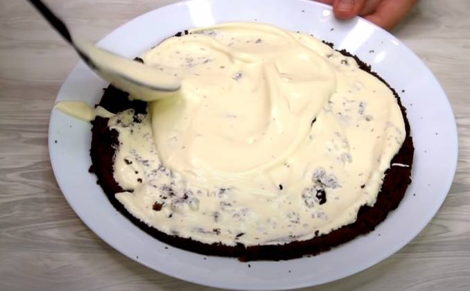 5. Теперь получившийся корж разрезаем на 3 или 4 коржа, в зависимости какая у вас была форма, я сначала делаю надрезы ножом, затем разрезаю обычной ниткой, смазываем коржи с двух сторон кремом и укладываем друг на друга, промазываем бока и верх торта, украшаем по вашему желанию, я немного взяла бисквита и превратила его в крошку, при помощи блендера и теперь посыпала получившийся крошкой тортик, я еще украсила торт растопленным шоколадом, дадим тортику немного пропитаться, хотя если не терпится можно сразу приступать к дегустации.Видео рецепт ютуб ниже 👇