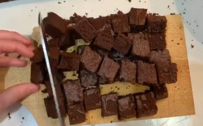 4. Приготовить глубокую круглую чашку в которой будете собирать торт и застелить ее пищевой пленкой. Из бисквита вырезать круг диаметром, как ваша чаша, он и будет основанием торта! Остальной бисквита порезать на кубики!