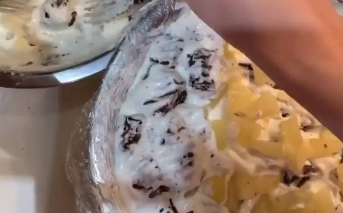 5. Обмакивая кубики в сметанном креме собрать торт, по желанию добавьте ананас и орех! Накрыть торт бисквитным коржом и отправить в холодильник минимум на 6 часов!