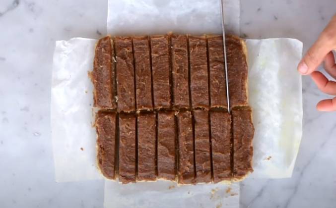6. Когда глазурь готова, можно достать из холодильника корж с карамелью и разрезать его на 16 частей. При разрезании, карамель также будет прилипать к ножу. Снова воспользуемся миской с водой. ❗️Окунайте нож, каждый раз как разрезаете корж и тогда никаких трудностей не возникнет.