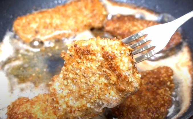 3. Мне понадобится 60 грамм панировочных сухарей, теперь измельчаем блендером грецкие орехи, 120 грамм, в миске смешаем грецкие орехи и панировочные сухари, мясо достаем из маринада и опускаем в панировку, обваливаем с двух сторон.