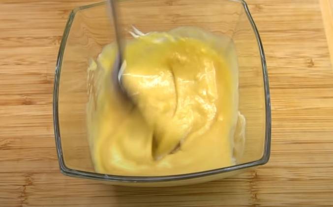 5. Пока мясо готовится приготовим горчичный соус, в ковш кладём одну столовую ложку сахара, вливаем одну столовую ложку воды, перемешиваем и ставим на огонь, как вода закипит с сахаром, кипятим секунд 50 и сразу снимаем с огня и сразу получившийся сироп переливаем в миску. Добавляем одну столовую ложку горчицы, одну столовую ложку майонеза и перемешиваем, теперь нужно попробовать и отрегулировать по вкусу, добавить еще горчицы или майонеза.Видео рецепт ютуб ниже 👇