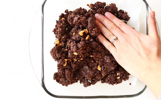 2. Выложите смесь брауни в небольшую форму для выпечки с подкладкой из пергамента и перед прессованием их рукой, добавьте оставшиеся 1/2 чашки грубо нарезанных грецких орехов (используйте оставшиеся 1/3 грецких орехов) и какао-бобы и перемешайте, чтобы равномерно все распределить. Затем надавите руками, пока слой не станет плоским и твердым. Мне нравится класть кусок полиэтиленовой пленки сверху, чтобы предотвратить прилипание и сделать его действительно плоским.