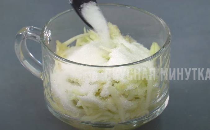 2. Перекладываю натертые яблочки, здесь у меня три штуки среднему размера, в стеклянную или керамическую емкость, добавляю чайную ложку лимонного сока и две - две с половиной столовых ложки сахара, перемешиваю это все, можно сахара и меньше добавить, но на наш курс именно такое количество в самый раз, тем более что тесто для блинчиков у меня совсем не сладкое.