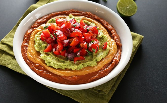 2. Затем приготовьте гуакамоле, смешав все ингредиенты в миске и отрегулировав приправы по своему вкусу. Сделайте то же самое с пико де галло (или просто используйте свою любимую сальсу). Чтобы приготовить мексиканский соус, выложите вниз глубокого блюда взбитые жареные бобы, затем сверху слой сыра.