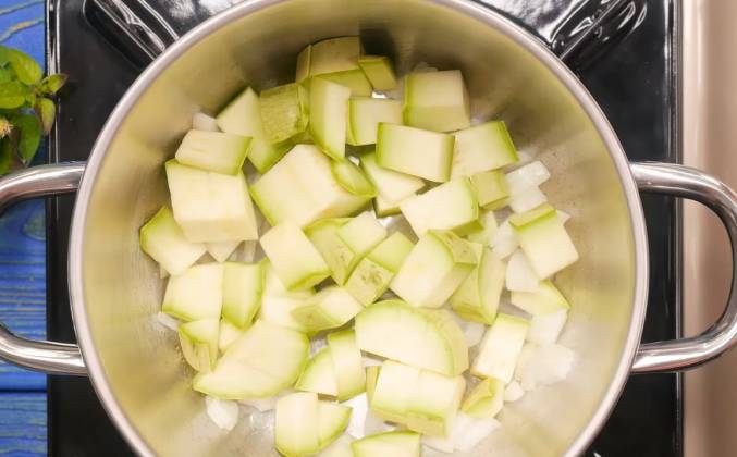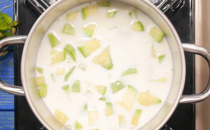 2. Репчатый лук нарезаю небольшими произвольными кусочками, выкладываю в кастрюлю с малым количеством растительного масла. Также некрупно режу кабачок и выкладываю в кастрюлю. По вкусу добавляю соль. Кастрюлю закрываю крышкой и на медленном огне тушу кабачки в собственном соку примерно 10-12 минут. В это время, отдельно кипячу молоко, и заливаю его в кастрюлю с кабачками. Добавляю специи: сушеный чеснок, черный молотый перец и щепотку мускатного ореха. При помощи погружного блендера, довожу до однородного состояния.