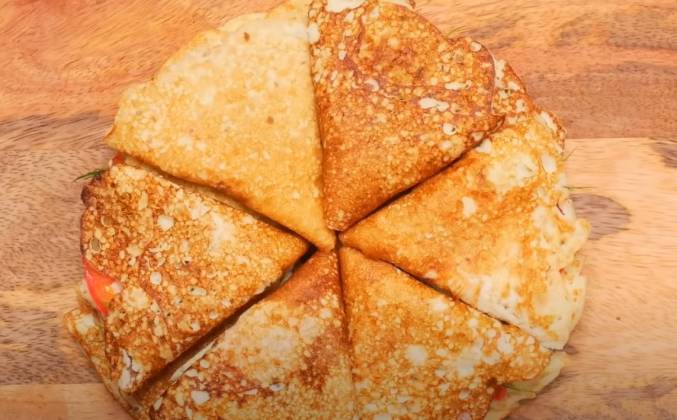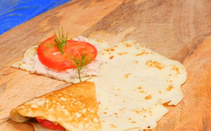 4. Блин выкладываю на доску, режу пополам. На одну третью часть каждой половинки выкладываю чайную ложку паштета. Распределяю тонким слоем сверху, кладу тонкий ломтик помидора и немножко укропа. Сворачиваю блинчик в аккуратный треугольник. Думаю на видео вполне видно как я это делаю.Видео рецепт ютуб ниже 👇