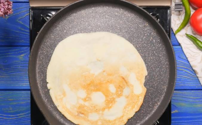 3. Перед тем как выпекать блины сковороду хорошенько разогреваю и смазываю первый раз растительным маслом. Наливаю небольшой половник теста и разравниваю вкруг примерно 15 сантиметров в диаметре. Выпекаю блины на огне ниже среднего. Главное не торопиться их переворачивать. Первая сторона должна хорошенько подрумянится и тогда блин перевернется легко. Такие блины хороши и сами по себе, но сегодня часть из них сделаю с начинкой.