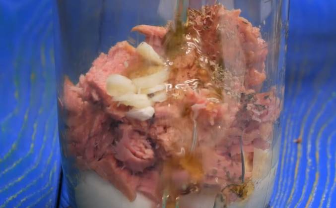 2. В глубокую емкость выкладываю 2 вареных вкрутую яйца. Туда же отправляю банку консервированного тунца в консервированного тунца в собственном соку. Жидкость с него слила. Еще кладу зубчик чеснока. Наливаю растительное масло и при помощи погружного блендера довожу паштета до однородного состояния. Перекладываю в подходящую баночку, убираю в холодильник.