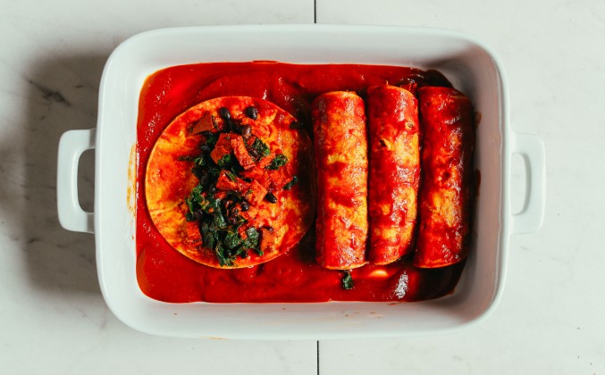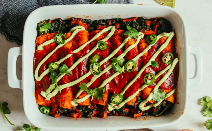 Дымные, сытные веганские энчиладас с черными бобами, жареным сладким картофелем и капустой! Этот рецепт содержит наш Легкий Красный Соус для энчилады. Идеальная простая еда из 9 ингредиентов для мексиканской ночи!