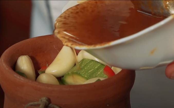 2. Кабачок, да несколько ломтиков этого кабачка. Может быть, пару помидор добавить? Да немножечко болгарского перца, вот, горсточка буквально. Несколько зубчиков чеснока для завершения картины. Посмотрите, вот масло осталось со специями, да еще и соль здесь есть. Нехорошо это. Место там свободное всегда найдется. Немного воды, заодно и миску помоем. А вместо крышки - клочок бумаги. Бичевочкой перевязал, и отправляется, знаете, куда? В баню. Но в баню он идет не помыться, он идет к истопнику. Истопник топит печь. Печь прикрыта либо листом железа, либо какими-то дверями. Этот кувшин не ставят внутрь печи, его ставят напротив дверей печи. И, верите или нет, что до конца рабочего дня в этом кувшине обед будет готов. Человек обычно платит несколько монеток еще и печнику. Если монеток оказалось чуть побольше, то печник возьмет и поставит ваш кувшинчик чуть подальше.