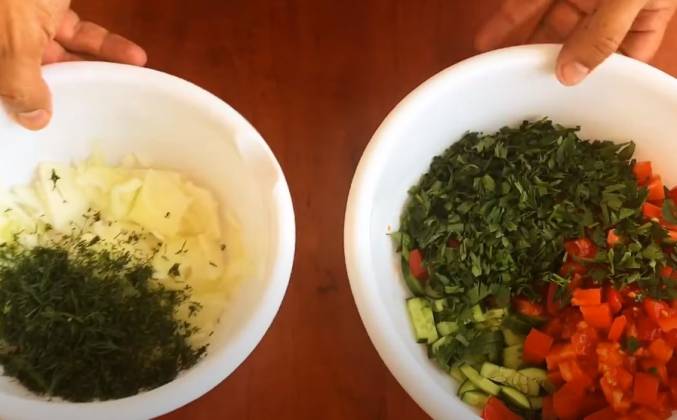 2.  При помощи рук надавливая от центра к краю формируем "Фатир", при помощи пекарского инструмента (чекич) выбиваем на лепешке красивый узор. Выпекаем "Фатир" в духовке при 200 градусах в течении 25 минут. Пока "Фатир" готовиться займемся приготовлением мяса и овощей. Мясо режем небольшими кубиками и обжариваем в течении 20 минут, соль и черный перец добавляем по вкусу. 3.  Нарезаем огурцы и помидор произвольно, как на обыкновенный салат.  Добавляем к огурцам и помидору нарезанный пучок петрушки. Теперь в отдельную посуду шинкуем лук мелко и добавляем к нему нарезанный укроп.  Разводим в теплой воде сюзму (чакка). Солим по вкусу, но лучше что бы соли было по больше! За то время что нарезали овощи , "Фатир " приготовился , мы его достали из духовки и оставили остывать.