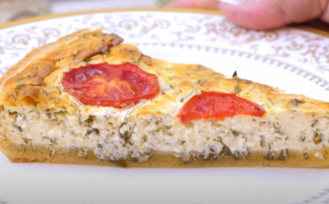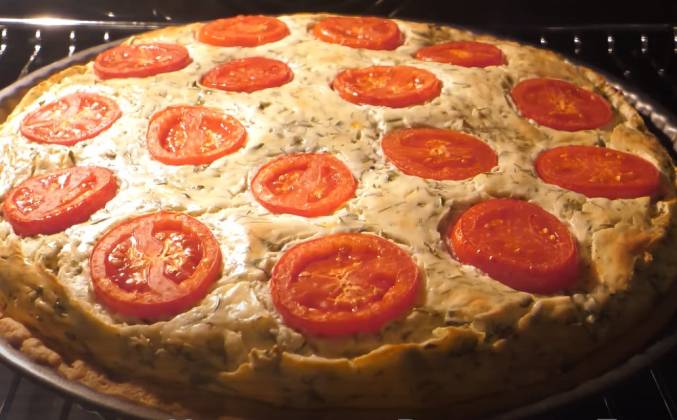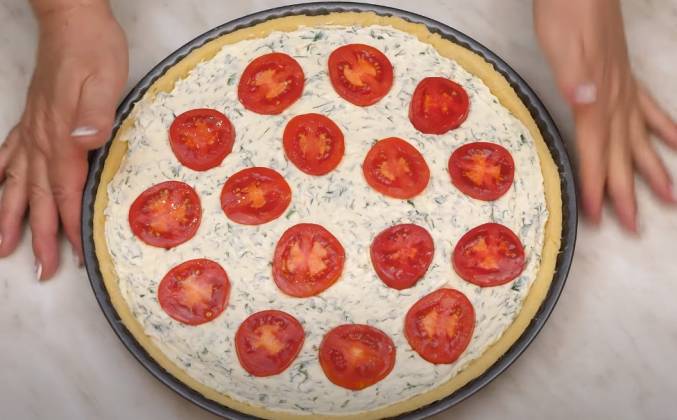 5. Выкладываем всю начинку в форму и равномерно ее распределяем. Поверх начинки укладываем нарезанные помидоры и слегка их вдавливаем. Отправляем форму с пирогом в заранее разогретую до 180-190°C духовку и выпекаем на втором или третьем снизу уровне, на режиме верхний и нижний нагрев без конвекции в течение 50-60 минут. Если будете готовить пирог с конвекцией - убавьте нагрев в духовке на 15-20 градусов. Готовность пирога определяем наличием золотистой корочки и плотной пружинящей начинки. Достаем его из духовки, даем слегка остыть до теплого состояния и с помощью широкой лопатки перекладываем на блюдо или доску для подачи.Видео рецепт ютуб ниже 👇