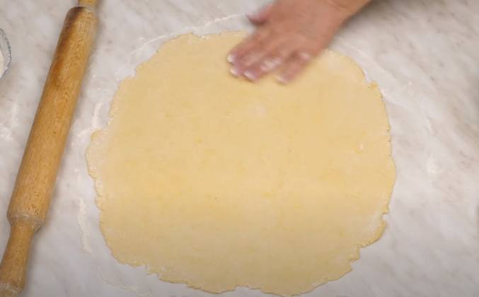 4. Толщина пласта примерно 0,5 см. У меня металлическая форма с антипригарным покрытием, диаметр по верхнему краю 30 см, по донышку 26 см, высота бортиков 3 см. Накручиваем тесто на скалку и переносим на форму. Хорошо распределяем по внутренней поверхности, остатки аккуратно срезаем острым ножом. Можете испечь из них вкуснейшие хрустящие крекеры, приготовить тарталетки или убрать в морозильник до следующего раза. Поскольку у нас совершенно не жидкая начинка, то нет необходимости заранее выпекать песочную основу, но наколоть ее надо, чтобы не вздувалась при выпечке.
