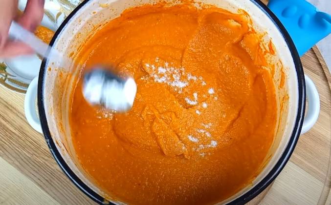 2. В процессе перемешиваем пять шесть раз крышку плотно не закрываем. Чтобы томатная паста не подгорело выкладываем ее сверху, разравниваем лопаточкой продолжаем варить ещё 20 минут, за это время перемешиваем два три раза добавим соль, сахар, специи, перемешаем, дадим покипеть несколько минут. Снимаем с огня, измельчаем блендером, игра получилась ярко-оранжевого цвета, приятный аромат, хорошо держит ложку, просто супер, такую икру вы никогда не поменяете на магазинную, сейчас самое время попробовать на соль, если необходимо добавьте соль или специи по вкусу.