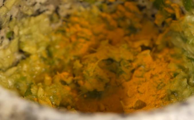 2. Овощи, зелень, витамины - все это замечательно, но человеческому организму для нормального функционирования необходим белок. Белок в Индии предпочитают получать из гороха нут, из чечевицы, из маша, из других бобовых. Я сегодня выбрал нут и чечевицу "Националь". Но этими замечательными продуктами мы займемся несколько позже, а в индийской кухне все начинается с лука и чеснока. Весь лук опускаем в глубокий сотейник, к луку добавляем масла и немного воды. Включаем нагрев, и пусть жарится, а сами пока займемся чесноком, имбирем и перцем. Имбирь сначала нарежем тоненькими ломтиками, а затем покрошим насколько возможно. Я очень люблю запах свежего имбиря, но запах свежего зелененького перца люблю не меньше. Теперь сюда надо добавить немного соли, я думаю, примерно 1 чайную ложку, и растереть в однородную пасту. Не забывайте про лук. Чтобы лук на первых порах пропарился и прогрелся как следует, можно накрыть сотейник, пусть постоит под крышкой, поджариться он всегда успеет, открыл крышку, 2 минуты, и он готов. Ну, полюбуйтесь! Разве не красота?