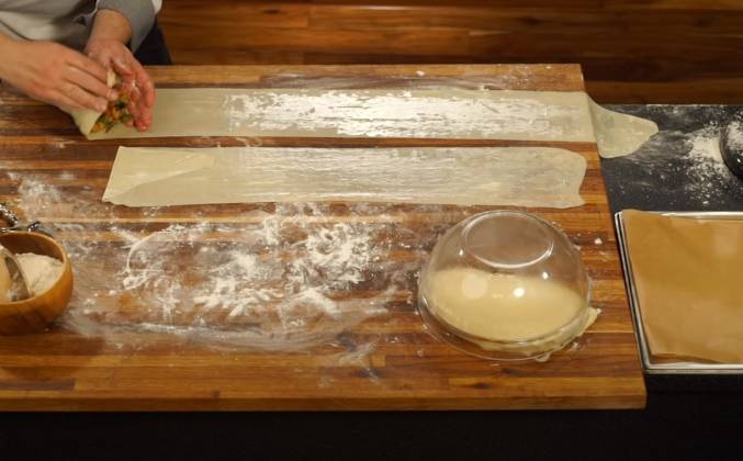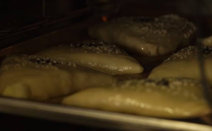 5. Баклажан я специально оставил на самый конец для того, чтобы он не потемнел. Посмотрите, как лук пожарился. Вот этот лук даст столько вкуса и аромата, сколько все эти овощи не дадут. Специи обязательно надо обжарить, но имейте в виду, что чем дольше вы их жарите, тем больше аромата они теряют. Ну и все, готов наш фарш. Осталось все только перемешать. Начинка готова, и тесто тоже стало очень мягким, податливым для раскатывания. Хотя раскатывать я все равно его буду на машинке. Раскатанные полоски теста надо щедро смазать маслом. Укладываем ложку фарша равнобедренным треугольником. Раз подворот, два подворот, три, и прекрасная самса. Вот это тесто сюда натянем. Нижнюю ее сторону сразу же смажем маслом. Укладываем на противень. Ну а первый-то противень уже готов, можно нести выпекать. Осталось только посыпать кунжутом, нигеллой, то, что называют по-русски чернушка, по-узбекски, по-таджикски седана.