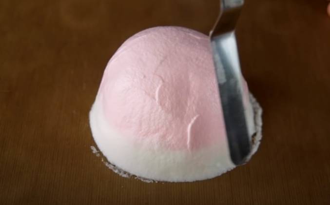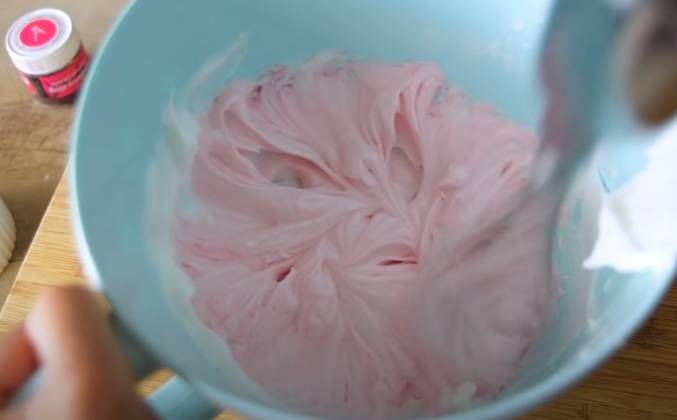 3. Я сразу половину этой белой воздушной облачной массы выкладываю на противень, застелив его предварительно либо бумагой для выпечки, либо тефлоновой бумагой и распределяем в виде такой площадки, в оставшуюся часть добавляю немного розового красителя и взбиваю до полного его растворения, до получения однородного цвета. И вот эту нежную розовую массу выкладываю сверху, опять же ничего распластать, размазывать не нужно, пусть получится такая горка, с помощью лопатки аккуратно придаем этой горки форму полусферы, излишки у основания убираем салфеткой или бумажным полотенцем.